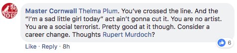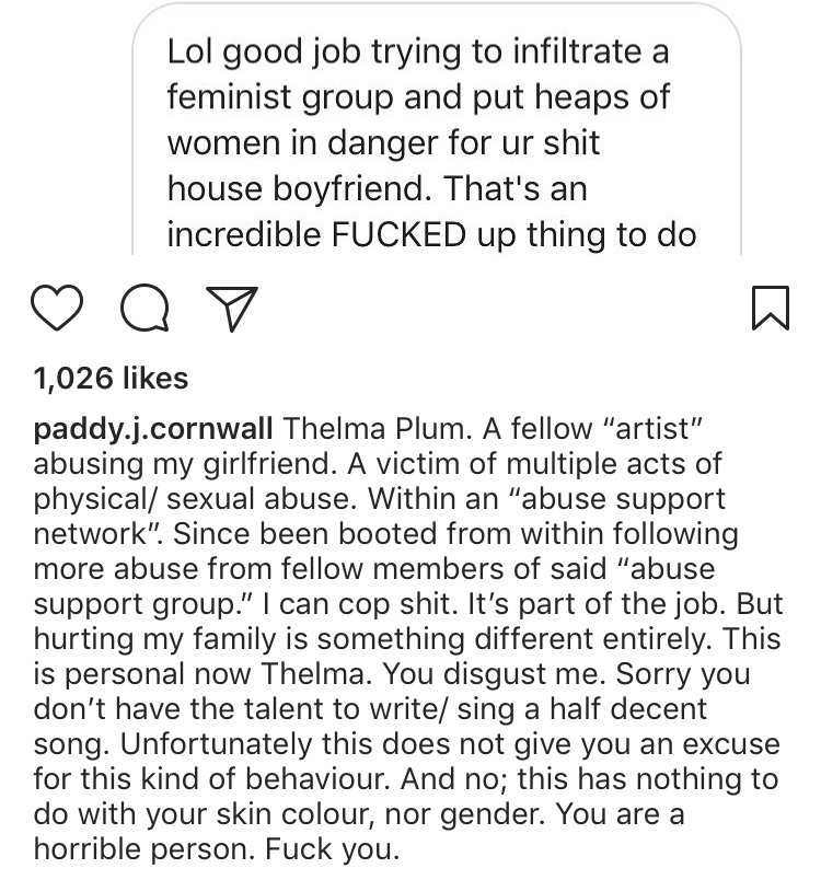 “Thelma Plum. You want a fight? You’ve got one now mate. Fuck with my family? That is that. And don’t you dare try and twist this into something racial/gender orientated you spineless, talentless, sociopathic piece of human garbage.