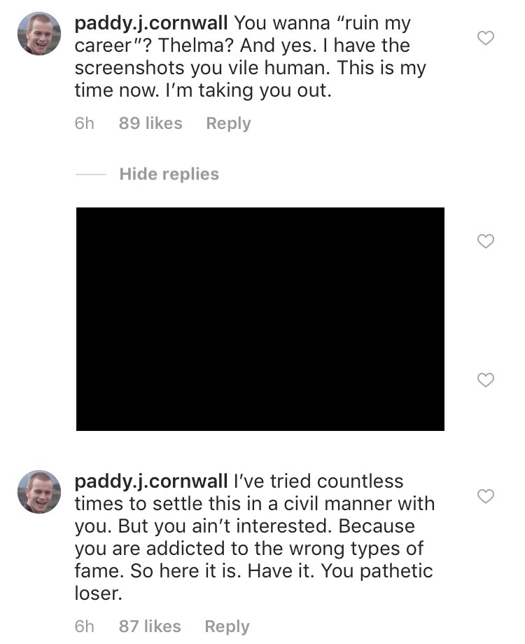 View Paddy Cornwall’s Instagram and Facebook comments, below.