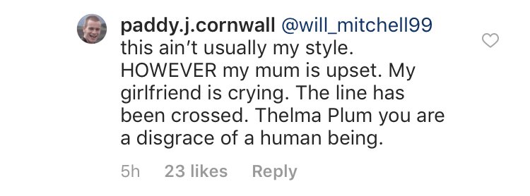 “This ain’t usually my style. HOWEVER my mum is upset. My girlfriend is crying. The line has been crossed. Thelma Plum you are a disgrace of a human being.”