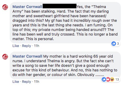 Over on Facebook, Cornwall claimed that what he called the “Thelma Army” had been “stalking” him and his family.