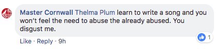 “Sorry you don’t have the talent to write/sing a half decent song. Unfortunately this does not give you an excuse for this kind of behaviour. And no; this has nothing to do with your skin colour, nor gender. You are a horrible person. Fuck you.”