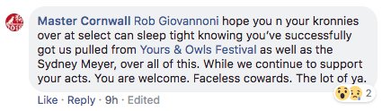 In his comments, Cornwall also alleged that Sticky Fingers were once pulled from the lineup of Wollongong’s Yours & Owls Festival, as well as a performance at Melbourne’s Sidney Myer Music Bowl.