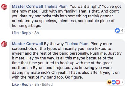 “By the way Thelma Plum. Plenty more screenshots of the types of insanity you have texted to myself and the rest of the band personally. Push me. Just try it mate. Hey by the way. Is all this maybe because of the time that time you tried to hook up with me at The Great Northern in Byron [Bay], and I rejected you knowing you were dating my mate Nick? Oh yeah. That is also after trying it on with the rest of my band too. Go figure.”